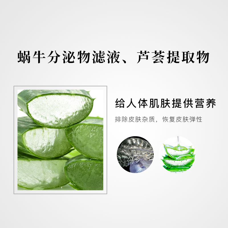 | 产品特性说明 | 银耳(TREMELLA FUCIFORMIS)多糖、蜗牛分泌物滤液、芦荟(ALOE VERA)提取物、无患子(SAPINDUS MUKUROSSI)果提取物,不仅给人体肌肤提供营养,还具有抗衰老、等功效,增进新陈代谢,排除皮肤杂质,恢复皮肤弹性 |
